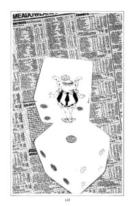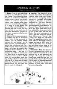 RANGE: From the two dollar Show window at an off-the-beaten track to the Chicago Commodities Exchange; from the jai alai frontons of Miami to the dog tracks of Tuscon; from jumping contests of celebrated frogs to the Sacred Heart basement bingo game around the corner; from the cock fights of El Barrio to the free floating crap games of the nation’s Holiday Inns— wherever the urge to push your luck burns a hole in your soul, you will surely find the Daemon Runyon: the low rollers’ companion and archenemy of Lady Luck. HABITS: He draws your attention to a surething long shot in the Racing Form—where he has previously inserted a typo. He whispers random numbers in a card counter’s ear. He helps you draw to an inside straight if anyone else is holding a flush. He is small enough to ride a tossed coin and stand it on end and tall enough to slam dunk home the shot that helps the Lakers beat the spread . . . and you. He’ll steer you to a sucker the morning after he’s blown his roll. He lets you win from welshers and makes you loose to Mafia dons. He’s the one-armed bandit who trips the filly in the home stretch, slides your chip off the double zero just before it hits, tips the heat to your bookie’s address before you can collect, and drowns you in the office pool. HISTORY: The Daemon is a descendant of the Fadas, those glittering creatures native to the French Riviera. His motive for immigrating remains obscure (for Europeans are as easily tempted as Americans to punt the patrimony on a long shot), but come he did, to work his scams and cons from the beaches of New Jersey to the Sands of Vegas. His first recorded act in the New World was to greet Columbus and tout him it was seven-to-five he had hit the Indies. He later gave Custer the same odds against the Sioux. With his parimutuel friends, Jack O’Diamonds, “Auntie” Up, “Three Card” Monty and “Old Snake Eyes,” he caused havoc on the river boats of the old Mississippi. Daemon’s biggest sting was in 1929, when he called all the bluffs, broke the bank, and left Uncle Sammy sitting at the table in his red, white, and blue underwear. SPOTTER’S TIPS: The Daemon Runyon can be seen riding a cab to the track, and the bus back. He sits on the shoulder of a fat man weeping in an all-night coffee shop. He smells of cheap cigar smoke and bar rye. He sounds like the slap of a flush-busting card on green felt. He tastes like finger nails. He feels like the simultaneous breaking of your heart, your bank account, and your leg.