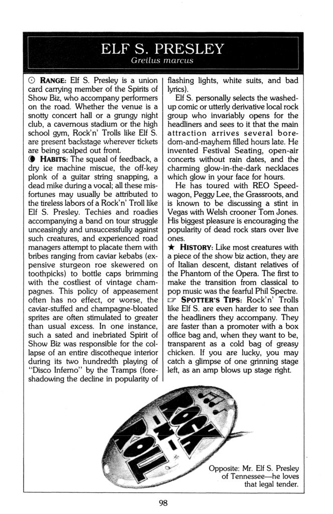 HABITS: The squeal of feedback, a dry ice machine miscue, the off-key plonk of a guitar string snapping, a dead mike during a vocal; all these misfortunes may usually be attributed to the tireless labors of a Rock’n’ Troll like Elf S. Presley. Techies and roadies accompanying a band on tour struggle unceasingly and unsuccessfully against such creatures, and experienced road managers attempt to placate them with bribes ranging from caviar kebabs (expensive sturgeon roe skewered on toothpicks) to bottle caps brimming with the costliest of vintage champagnes. This policy of appeasement often has no effect, or worse, the caviar-stuffed and champagnebloated sprites are often stimulated to greater than usual excess. In one instance, such a sated and inebriated Spirit of Show Biz was responsible for the collapse of an entire discotheque interior during its two hundredth playing of “Disco Inferno” by the Tramps (foreshadowing the decline in popularity of flashing lights, white suits, and bad lyrics).