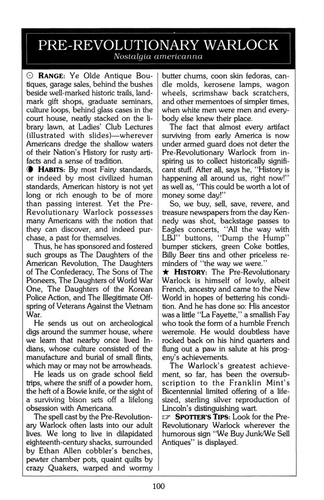 standards, American history is not yet long or rich enough to be of more than passing interest. Yet the Pre-Revolutionary Warlock possesses many Americans with the notion that they can discover, and indeed purchase, a past for themselves. Thus, he has sponsored and fostered such groups as The Daughters of the American Revolution, The Daughters of The Confederacy, The Sons of The Pioneers, The Daughters of World War One, The Daughters of the Korean Police Action, and The Illegitimate Offspring of Veterans Against the Vietnam War. He sends us out on archeological digs around the summer house, where we learn that nearby once lived Indians, whose culture consisted of the manufacture and burial of small flints, which may or may not be arrowheads. He leads us on grade school field trips, where the sniff of a powder horn, the heft of a Bowie knife, or the sight of a surviving bison sets off a lifelong obsession with Americana. The spell cast by the Pre-Revolution-ary Warlock often lasts into our adult lives. We long to live in dilapidated eighteenth-century shacks. surrounded by Ethan Allen cobbler’s benches, pewter chamber pots, quaint quilts by crazy Quakers, warped and wormy butter churns, coon skin fedoras, candle molds, kerosene lamps, wagon wheels, scrimshaw back scratchers, and other mementoes of simpler times, when white men were men and
