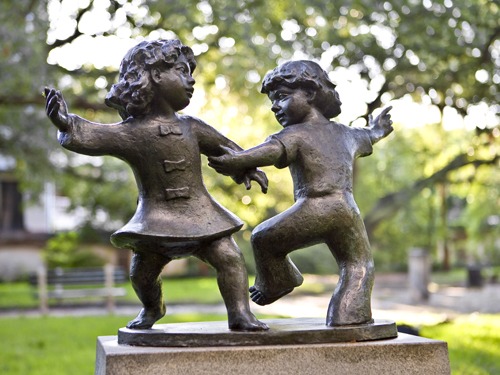 Entering the park from Chalmers Street, to the right of the path stands a statue of dancing children, “Do-Si-Do,” atop a monument dedicated to Charleston designer, preservationist, and philanthropist Marguerite Sinkler Valk. Its creator, sculptor Willard Hirsch, was born in Charleston in 1905 and attended the