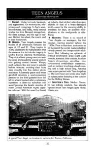 RANGE: Under hot rods, barstools, and appreciated. On motorcycles, telephones and crying jags. In back seats, record stores, and really, really serious trouble this time. Beneath strange hats, the class average, and the age of reason. Behind the wheel, the couch, and in their homework. HABITS: Teen Angels possess the bodies of all Americans between the ages of 12 and 21. They inspire in every adolescent the hallucination that the universe is a technicolor tragedy in Dolby Stereo starring themselves. They trick athletic young men into writing verse and academic young women into getting contact lenses. Wimpy math whizzes flex and pose in private before mirrors; working-class louts stare moodily into bus station photo machines. A formerly grave and sober girl-child develops a soul-consuming passion for the third guitarist from the left in a band named after a veterinary operation; a clean-cut suburban cub scout becomes the fanatic devotee of some Central American mystic agrarian reformer. With the onset (or threat) of puberty, their victim’s attention span shrinks to that of a brain-damaged moth—save for the uncanny ability to meditate, for days, on possible modifications to the mudguards or sideburns. HISTORY: There is no record of Teen Angels—or teenagers, for that matter—having existed before the 1950s. Prior to that time, in America as in the rest of the world, mature children simply passed into irresponsible adulthood. But, following an epidemic of ballad-celebrated grad-night auto wrecks, romantic bike crashes, lovelorn beach drownings, sensitive, misunderstood switchblade massacres, and an incident involving a level crossing and a high school ring, America was as jam-packed with Teen Angels as a fifty-cent-beer-and-extra-slice-night at a pizza parlor featuring a free concert by the Rolling Stones. SPOTTER’S TIPS: Mother Nature, in her infinite wisdom, has already spotted most Teen Angels quite nicely, thank you. A typical Teen Angel, on location in rock’n’rollin’ Encino, California.