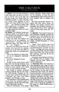 RANGE: From that first moment in math class when you get it—or dont get it—all the way to the day you proudly accept your Nobel Prize for explaining quarks—or stand shivering on a street comer, figuring on your fingers how many nickels for a cup of soup … the Calcubus is either with you or against you: a continuous function, either positive or negative. In plane geometric terms, he is your Guardian Angle. HABITS: The Calcubus hovers over restaurant tables, in the backs of cabs, and anywhere else people try to figure out what the tip should be. There are those who believe the Calcubus to be an imaginary, or “hypothetical,” number—since all statements about him begin with an “If. . .” or a “Suppose But there are those who know differently, who have felt the creature swoop out of the blue and either a) inspire their minds, or b) paralyze their brains. Now, if the Calcubus (c) exists, then, Let (a) be designated mathematicians, and Let (b) be designated morons. Q. E. D. ! In days of yore, some morons could fake their way through fractions, long division, even elementary algebra, by means of brute memory or by visual access to smart students’ answers. But, thanks to modern, advanced teaching methods, like the new math, the Arithmetically Hopeless are discovered much sooner these days and “streamed” into other, more fitting programs, like theology or shop. This separation of the sharpshooting sheep from the gormless goats is accomplished with the help of the aptly named Differential Calcubus. With the introduction of the simple pocket calculator, things looked grim for the Calcubus, as even the most mathematically inept mortal could perform fantastic feats of addition and such. But these resourceful demons conspired with their fellow fairies, the Glitches, and quickly removed from circulation any miniature computer on which anyone but an M.I.T. graduate could do more than locate the “on” switch. HISTORY: That ancient Greek wizard Pythagoras originally conjured the Calcubus, but it was Euclid who first put the creature to work. He set the nasty thing down in the middle of a bridge—his Fifth Proposition, or “Pons Assinorum.” “Asses,” that is, all but a few of his students (or any students since), were unceremoniously booted off the “Pons,” or bridge, and never reached the other side and the neat and orderly land of the Giant Trig—which sounds like California, what with all the sins and tans out there. In America, those blessed at birth by the Calcubus tend to myopia, chess mastery, and the violin. Hence, few survive adolescence. SPOTTER’S TIPS: The Calcubus is often detectable near a wisp of smoke: the smoke that smells like burnt rubber shooting from the ears of those cursed by the creature as they stare at their unbalanced bank books; the fatherly, tweed-and-leather scented smoke arising from the briar of a meditative M.I.T. quantum mechanic; the fine, bright, odorless trail of smoke still drifting over test sites across the Southwest; or the singe of the Calcubus’s own wings as it pays a visit to microchip specialists on the verge of a 256K breakthrough in Silicon Valley.