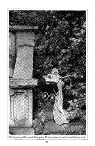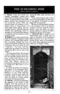 RANGE: These tiny terrors are actually “changelings”—wicked creatures which the fairies swap for human babies. Screaming Mimis infest public places: churches, fine restaurants, and the occasional concert. Their earpiercing shrieks are inevitable on any public means of transportation, as well —trains, buses, planes, and (especially) elevators. Although hideously audible and appallingly visible to strangers, the Screaming Mimi appears to members of its own family as a sweet chirping cherub. HABITS: It is a curious paradox that while the birthrate of American infants declines, the Screaming Mimi population is booming. Perhaps this is because the minuscule monsters are most commonly seen and heard by the “child-free.” The more child-free adults there are around, the more the Screaming Mimi will be seen—and feared. The Screaming Mimi’s full throated howls of outrage, boredom and frustration are especially upsetting when they occur, as they most often do, in outrageously boring and frustrating situations. (See “Range,” above). For shamelessly expressing what the rest of us actually feel, Mimi draws a lot of dirty looks. To all but its mother, the most horrible aspect of the Screaming Mimi’s behavior is its vampire-like quality. Believe it or not, those haunting, unearthly, nocturnal wails signify the creature’s desire to fasten its mouth upon the breast of a mortal woman and extract the life-giving fluids! HISTORY: This fiend-in-infant-form first appeared in the cradles of Olde England. This may account for the Anglo-Saxons’ preference for the companionship of dogs and their habit of belaboring the buttocks off their offspring with flails, canes, and stout oak cudgels. To the thatch-brained serfs of Britain, the Screaming Mimi was known as a “Changeling.” In America, it is often diagnosed as hyperactive. Numerous Screaming Mimis yowling in the homespun cribs of the thirteen original colonies inspired Daniel Boone, Lewis and Clark, and other pioneer patriarchs to explore the West. Anything to get out of the house. SPOTTER’S TIPS: In addition to its characteristic noise, a certain odor is often an indication of the Screaming Mimi’s presence. It’s a sort of ammonialike aroma, alone or accompanied by a dark, heavy sulphurous scent not unlike that of English cooking. This Screaming Mimi needs Changeling. Mother wishes the stork would take her back.