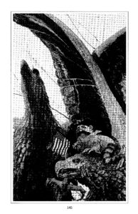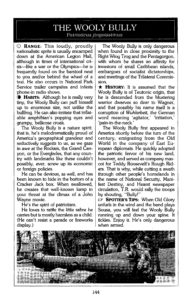 RANGE: This loudly, proudly nationalistic sprite is usually encamped down at the American Legion Hall, although in times of international crisis— like a war or the Olympics—he is frequently found on the barstool next to you and/or behind the wheel of a taxi. He also occurs in National Park Service trailer campsites and infests phone-in radio shows. HABITS: Although he is really very tiny, the Wooly Bully can puff himself up to enormous size, not unlike the bullfrog. He can also imitate that inflatable amphibian’s popping eyes and grumpy, bellicose croak. The Wooly Bully is a nature spirit: that is, he’s melodramatically proud of America’s geographical grandeur and seductively suggests to us, as we gaze in awe at the Rockies, the Grand Canyon, or the Everglades, that any country with landmarks like these couldn’t possibly, ever, screw up its economic or foreign policies. He can be devious, as well, and has been known to hide in the bottom of a Cracker Jack box. When swallowed, he creates that well-known lump in your throat at the climax of a John Wayne movie. He’s the spirit of patriotism. He loves to rattle the little sabre he carries but is mostly harmless as a child. (He can’t resist a parade or fireworks display.) The Wooly Bully is only dangerous when found in close proximity to the Right Wing Trog and the Pentagorgon, with whom he shares an affinity for invasions of small Caribbean islands, embargoes of socialist dictatorships, and meetings of the Trilateral Commission. HISTORY: It is assumed that the Wooly Bully is of Teutonic origin, that he is descended from the blustering warrior dwarves so dear to Wagner, and that possibly his name itself is a corruption of Wuhlarbeit, the German word meaning ‘agitator,’ ‘irritation,’ ‘pain-in-the-neck.’ The Wooly Bully first appeared in America shortly before the turn of the century, emigrating from the Old World in the company of East European diplomats. He quickly adopted the patriotic fervor of his new land, however, and served as company mascot for Teddy Roosevelt’s Rough Riders. That is why, while cutting a swath through other people’s homelands in the name of National Security, Manifest Destiny, and Hearst newspaper circulation, T.R. would rally the troops by shouting, “Bully!” SPOTTER’S TIPS: When Old Glory unfurls in the wind and the band plays Sousa, you will feel the Wooly Bully running up and down your spine. It tickles. Enjoy it. He’s only dangerous when armed.